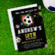 Join us for a vibrant soccer-themed birthday bash! Celebrate amidst colourful soccer balls and rainbow paint splatters against a sleek black backdrop, with a lively yellow reverse side. This playful invitation promises joy for kids, teens, and adults alike. Customize the details and make it your own, from the text to the atmosphere. With bold sport fonts in striking white and bright yellow, let's kick off a memorable day and immerse yourself in the excitement of soccer to create unforgettable memories together!