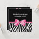 A trendy black and white zebra print baby shower invitation with a cute pink ribbon bow wrapped like a present. Personalize to invite your guests to attend. Flat printed image, not actual bow.