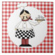 Carreau de céramique ou trépied avec la frontière checkered rouge et blanche et le chef mustached tenant cuire la pizza à la vapeur. Une addition parfaite à tout décor de cuisine ou de restaurant.
