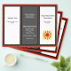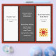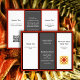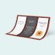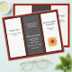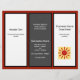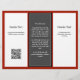 Business flyer brochure in black, red and white with six panels for text, on both sides of 8.5 x 11 inch paper. Side one has two white panels with a dark grey panel in the centre. The background is dark red. This side will be the outside pages of the brochure when folded. Add a logo to the front page using the template. Side two holds the text for inside pages, along with a place for a QR code. The centre is for an "about" section.
