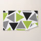 Cette serviette à main présente un motif géométrique abstrait moderne de triangles vert citron, gris et noir disposés aléatoirement sur un arrière - plan blanc.