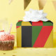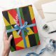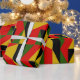 This wrapping paper has a Black History design of triangles and rectangles in gold, red, green, and black making a pattern.