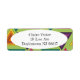 Ces étiquettes d'adresses de retour ont une conception des années 1970 sur des triangles concentriques dans les tons turquoises, orange, jaune, violet et rose sur un champ de vert.