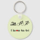 A great little gift for anyone who takes part in triathlons. This keychain has a fun slogan in black text with a red heart, on a pale lime green background. There are three pictogram icons of the challenges involved - swimming, cycling and running - and the caption is "I love to tri".