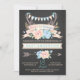 Tribal gender reveal invitations with arrows and floral antlers dressed up with a banner and bunting with rustic text and chalkboard arrow background. You can easily customize this tribal gender reveal invitation by simply adding your details.