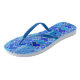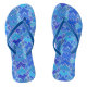 Flip flops in an African inspired contemporary take on a tribal textile print, rendered in a batik dyed texture - shades of cobalt blue, cerulean blue, and turquoise blue, accented with white