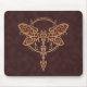 A tribal dragonfly decorated with intricate swirl patterns. The symmetrical design is framed by a simple circle that disappears under the dragonfly’s tail and wings.