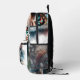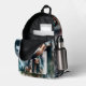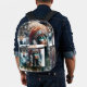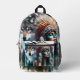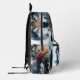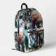 This visually powerful backpack features a Native American figure in full feathered headdress alongside a realistic wolf, both immersed in a forest setting. Their ritual dance evokes spiritual connection and strength, while turquoise and red face paint adds vivid contrast. The artwork spans the entire backpack, blending cultural reverence with natural symbolism.