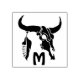 A longhorn bull black skull done in black ink tribal tattoo style. From one of the horns is a black feather in a stencil style. Between the skull and feather is a white that is meant for changeable monogram. The is short for monogram and can be changed as the heart desires.