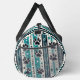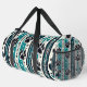 This stylish duffel bag features a unique tribal-inspired pattern in shades of teal and blue, adorned with decorative paw prints and striped accents. It's a functional gear bag and portable Weekender, durable for travel or the gym.