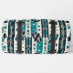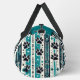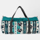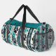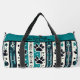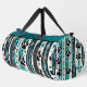 This stylish duffel bag features a unique tribal-inspired pattern in shades of teal and blue, adorned with decorative paw prints and striped accents. It's a functional gear bag and portable Weekender, durable for travel or the gym.