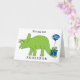 A triceratops dinosaur birthday son card with a Happy Birthday balloon attached to the present. You can easily personalize this kid's dinosaur birthday card with their name. Inside the birthday card reads "Biggest birthday wishes for a dino-mite kid!" which you can also change if you'd like. The back reads "Happy Birthday 2018". Great for the birthday boy who loves dinosaurs!