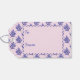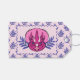 A girly pink and purple triceratops portrait flanked by abstract purple leaves is the subject of the design embellishing this gift tag.