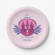 A girly pink and purple triceratops portrait flanked by abstract purple leaves is the subject of this fun and easy to customize graphic birthday paper plate design.