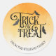 Add a custom touch to your Halloween favours with this editable “Trick or Treat” round sticker. Featuring elegant typography, flying bats, and a warm orange watercolor background, it’s ideal for sealing treat bags, party favours, or festive envelopes. Personalize with your family name, event title, or special message for a one-of-a-kind Halloween detail guests will love.
