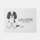 Destei's original cartoon illustration of a cute tricolor coat colour Cavalier King Charles Spaniel breed dog who is sitting. There is also text that now reads "Welcome" together with a personalizable text area for a family name or other custom text. The background has a pattern of grey paw prints.