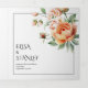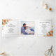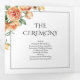 This beautifully designed tri-fold program for a wedding ceremony and celebration showcases exquisite peach peony flowers complemented by delicate sage green leaves adorning the corners. The interior centerpiece highlights a cherished photograph of the couple, creating a personal touch. The couple's names are elegantly displayed in decorative typography, while each panel is elegantly bordered with slender black lines, adding a refined finish to the overall presentation.
