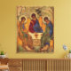 Trinity Angels At Mamre beautiful medieval christian painting by andre rublev of his interpretation of the trinity with three angels with golden wings, halo, green, blue, and gold cloaks, sitting together around a table with a golden bowl. medieval times illustrative fine art painting in blues, golds, and greens, in a delicate and refined religious painting. beautiful golden colours in a stylised and stylish design and colours with elegant lines and crisp fresh golden colours with shabby but colourful and radiant effect.