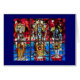 This poster is a reproduction of the Trinity Stained Glass Window designed and created for the home of Bikram Choudhury. It is composed of three stained glass panels - Lord Brahma, Lord Vishnu, and Lord Shiva.