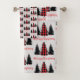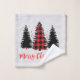 Superbe déco saisonnière hivernale avec un trio de silhouettes d'arbres de Noël, au milieu un motif rouge et noir en plaid de buffle, avec le texte rouge "Joyeux Noël" sur arrière - plan gris clair