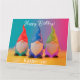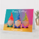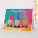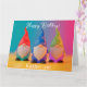 A vibrant and playful digital render of three stylized garden gnome figurines with a high-gloss ceramic finish. Each gnome features a tall, curved hat in red, blue, or lime green, paired with a white textured beard and a round peach-colored nose. The trio is arranged on a bright yellow surface against a colorful gradient background of teal, pink, and orange. Customize it for birthdays with the name of your choice.