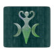 A beautiful Spiral Goddess between two crescent moons, creating a Triple Goddess. She appears as if made from frosted glass in shades of green, and purple tribal armband. The Triple Goddess represents the three cycles of womanhood: The Maiden, The Mother and The Crone.