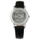 Women’s classic black leather strap watch with an image of a pewter Triple Goddess medallion. Triple Goddess is a concept in Wicca and other Neopagan belief systems: sometimes a universal, global, "Great Goddess" who is threefold; sometimes a single goddess as maiden, matron and crone; and sometimes three sisters. See matching round charm and drop earrings. See the entire Goddess Gemstones & Medallions Watch collection in the ACCESSORIES section.