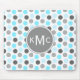Trendy, chic, girly blue and grey polka dot pattern with customizable trio of monograms representing your first, last and middle names. A cool, modern, geometric monogrammed gift for her.