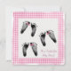 Pair of newborn girl footprints with polka dot bow and gingham frame for Triplet Girl Baby Shower invitation.