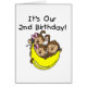 Trois petits singes, deux filles et un garçon, et une grande banane jaune sur les T-shirts Triplets 2e anniversaire, costumes, sacs fourre-tout, cartes, autocollants, magnets, et bien plus encore.