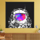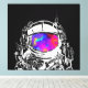 a colourful artwork featuring an astronaut wearing his spacesuit somewhere in black space while the spacefarer's helmet reflects a colourful surreal space nebula as a decorative canvas print.