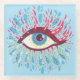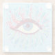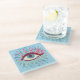 Psychedelic eye glass coaster with a colourful illustration of a weird blue eye with big curled pink eyelashes, light blue tears flowing everywhere and many pink and green elements - extensions of the eyelashes.