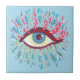 Psychedelic eye ceramic tile with a colourful illustration of a weird blue eye with big curled pink eyelashes, light blue tears flowing everywhere and many pink and green elements - extensions of the eyelashes.