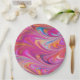 Paper plates with a cool trippy psychedelic design. Pink, orange and hints of blue all swirling around. Retro hippie vibe.
