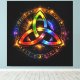 Rainbow-colored luminous triquetra symbol surrounded by a mystical circle adorned with esoteric glyphs, on a starry cosmic background.