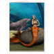rendu numérique 3D d'une belle sirène triste assise sur une pierre et d'un mignon dauphin sur un imaginaire bleu arrière - plan océanique