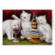 Cette image est si mignonne. Il y a trois chatons blancs et ils ont une bouteille de vin avec un verre. Il y a également des sardines. Ils aiment probablement ceux. Il est juste trop mignon pour des mots. Il y a un arrière - plan brillant rouge pour le placer tout. Il est dans le public domain.