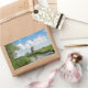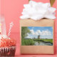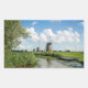 Un autocollant photo rectangulaire de trois moulins à vent le long d'un canal avec des bateaux et des roseaux sous un ciel bleu avec des nuages bouffants créant une scène paisible dans la campagne hollandaise de Leidschendam, la Pays-Bas.