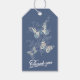 Jolies étiquettes cadeaux mariages idéales pour un cadeau très spécial à dire merci à votre invité ou pour les faveurs de mariage. Dessin simple à l'encre moderne de trois papillons en bleu foncé, corail, bleu ciel et crème sur le devant et un seul papillon dame peint au verso avec de l'espace pour vous de personnaliser avec votre propre nom à et des noms ou des mots. Idéal pour les marques cadeaux de mariage pour les mariages sur le thème des papillons ou d'autres occasions spéciales de papillon. D'autres articles correspondants sont disponibles. Art et design uniques par Sarah Trett pour www.mylittleeden.com et www.mylittleedenweddings.com sur zazzle.