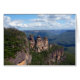 Trois Soeurs, Blue Mountains, NSW, Australie. Les Trois Soeurs est une formation rocheuse dans les Blue Mountains de la Nouvelle-Galles du Sud, Australie. Ils se trouvent à proximité de la ville de Katoomba et sont l'un des sites les plus connus des Blue Mountains, dominant la vallée de Jamison. Leurs noms sont Meehni (922 m), Wimlah (918 m) et Gunnedoo (906 m). Les Soeurs ont été formées par l'érosion. Le grès doux des Blue Mountains est facilement érodé au fil du temps par le vent, la pluie et les rivières, et les falaises entourant la vallée de Jamison sont lentement brisées. Des formations comme les Trois Soeurs sont créées lorsque l'eau s'infiltre dans de petites fissures dans la roche, les élargissant progressivement au fil du temps pour former de grandes indentations. Finalement, les Soeurs seront complètement érodées.