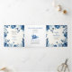 Cérémonie de mariage et programme de fête de la Chinoiserie à fleurs bleues. Avec un beau design chinois floral bleu orné de délicates fleurs de pivoines, cette carte s'inspire de la porcelaine et de l'art chinois classique. Les teintes cobalt, indigo et blanche évoquent l'élégance des peintures à l'encre, ajoutant une touche de romantisme à votre célébration. La pièce centrale intérieure met en valeur une photo chère du couple, créant une touche personnelle. Les noms du couple sont élégamment exposés dans la typographie classique, ajoutant de l'élégance à la présentation générale.