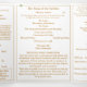La Messe Nuptiale Latine Traditionnelle est une célébration profondément révérente et belle du sacrement du Mariage, riche en tradition et profondément spirituelle. Conçu spécialement pour un mariage de Messe Latino Traditionnelle, le programme de mariage triplé "Vierge Marie TLM" contient les parties nécessaires du rite nuptial latin. La couverture avant porte l'image de la Vierge Marie affichée en ovale au coin supérieur droit au milieu de l'image des roses contre un arrière - plan blanc. L'en-tête est présenté dans une police nuptiale de couleur dorée, tandis que l'en-tête est affiché dans une impression claire. Les noms de la mariée et de la mariée sont également affichés dans une police Nuptial. Le nom et l'adresse de l'église apparaissent en bas dans un petit imprimé. Avec les explications de la Messe exposées partout, ce design élégant comprend également le nom du célébrant mariage, les noms des serveurs d'autel, les noms des parents de la mariée et des parents du marié, les noms de la fête de mariage y compris les noms d'une servante d'honneur et du meilleur homme, la salle pour jusqu'à sept demoiselles d'honneur et noms des groomsmen, ainsi que les noms de la fille-fleur et porte-bague. En outre, la conception de couverture arrière comprend la photo que vous fournissez affichée comme ovale sous un verset de la bible (ou votre message) contre un arrière - plan blanc. Tout le texte est personnalisable. Conçu pour coordonner avec la "Suite Mariage catholique Vierge Marie".