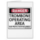 Danger, Trombone Operating Area! Ear Protection Required! This gives them fair warning! See all our musical designs on on cups, mugs, tee shirts, sweatshirts, hats, and other gifts and clothing.