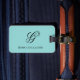 This soft turquoise monogram luggage tags is customizable, and is reminiscent of tropical tides. Personalize this turquoise luggage tag with any initial and any name which appears in black font. The monogram appears in scripty style font, and the remainder of the text is in crisp, clean all-cap font. Personalize the other side of the luggage tag with up to four lines of text for identification (name, street address, city, state, zip code and telephone number).