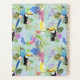Abstract shapes and squiggles match up with tropical foliage and toucans and parrots. Cheerful colours of aqua, green, hot pink, sunny yellow, and black and white make a multicolored palette.