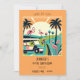 A bold and colourful, tropical art-deco-style 50th birthday party invitation in vibrant orange, green, and cream with pink flamingos, a golf cart, and palm trees. Use this flat card to celebrate your friend's, wife's, co-worker's, partner's, etc. 50th birthday with a game of golf followed by celebratory drinks and dinner. Hopefully, the birthday gal will be able to score a hole-in-one!