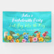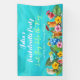 Tropical bachelorette party sign with blue waves design. Hawaiian flowers, big leaves and yummy cocktails make a border across the bottom of 2.5 x 4 ft. fabric sign. Customize in three places with the bride's name, party type (bachelorette or shower), "Last fling before the ring" - or other saying. Optional third template for date and location of the party / event. Perfect for a luau themed celebration.
