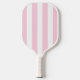 This pickleball paddle has a trendy Palm Beach aesthetic with banana leaves on a pink background and a monogram on a notched white square. The other side has pink and white stripes.
