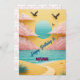 This vibrant and dreamy birthday card design features a paper-cut style tropical beach scene. A golden sandy path leads to the turquoise ocean under a gradient teal sun and soft pink clouds. Silhouettes of soaring birds add movement against the bright yellow sky. Perfect for beach lovers and anyone who enjoys tranquil coastal vibes. Ideal for birthday greetings, summer-themed parties, or inspiring travel lovers with a touch of whimsy.
