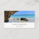 Business cards with a scenic nature photograph. Beautiful turquoise blue sea with a sandy beach. A big brown rock provides some shade from the bright blue sky.